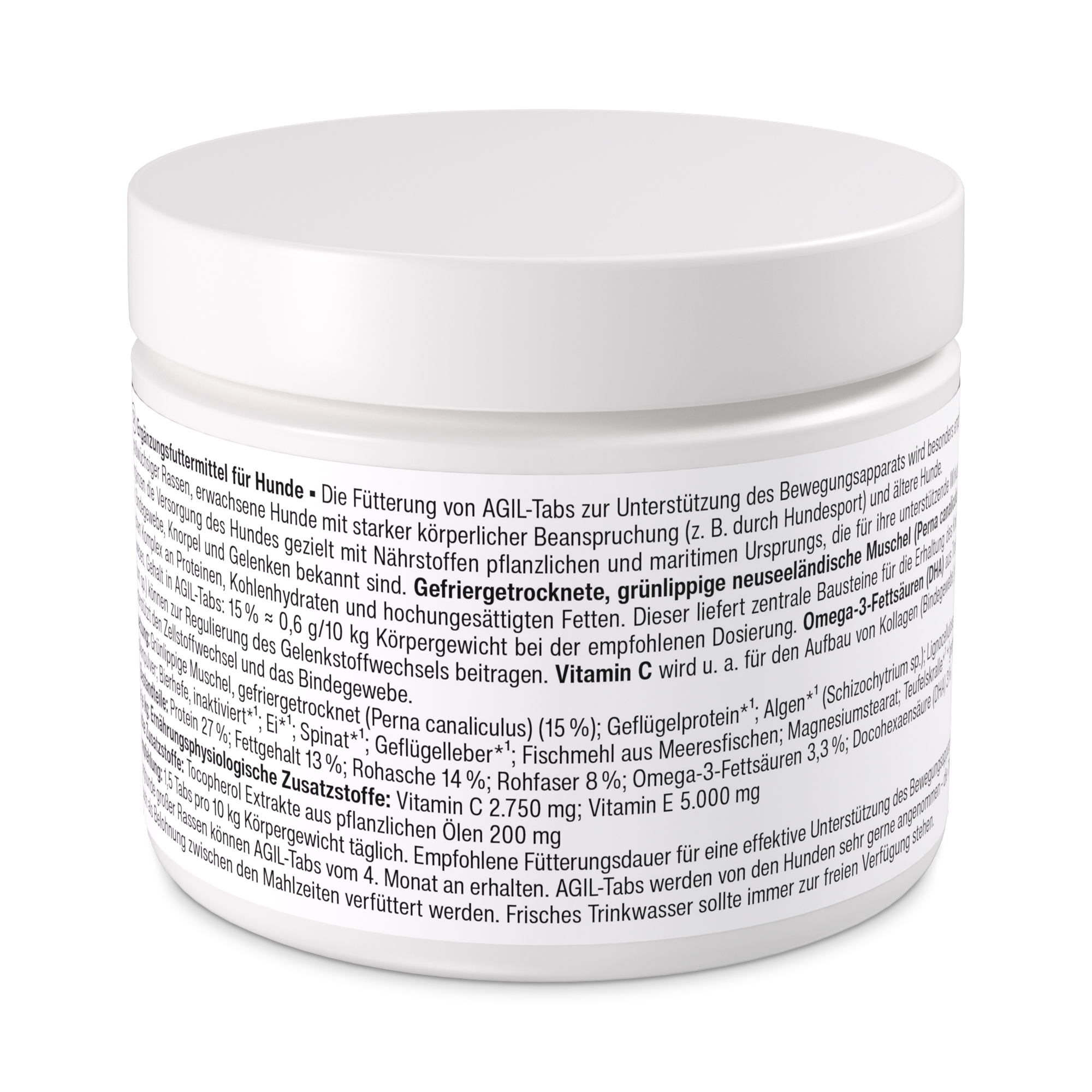 Tablety AGIL-Tabs cíleně doplňují stravu vašeho psa o živiny z měkkýšů a rostlin, které podporují správnou funkci pojivových tkání, chrupavek a kloubů. Mrazem sušené slávky zelenoústé z Nového Zélandu (Perna canaliculus) obsahují přirozený komplex bílkovin, sacharidů a polynenasycených tuků. Dodávají základní složky pro zachování chrupavky a pojivové tkáně; obsah v AGIL-Tabs je 0,6 g/10 kg tělesné hmotnosti v doporučeném dávkování. Omega-3 mastné kyseliny (DHA) ze sušených řas (Schizochytrium sp.) pomáhají regulovat kloubní metabolismus. Vitamin C je mimo jiné nezbytný pro tvorbu kolagenu (pojivové tkáně). Vitamín E podporuje buněčný metabolismus a pojivovou tkáň.